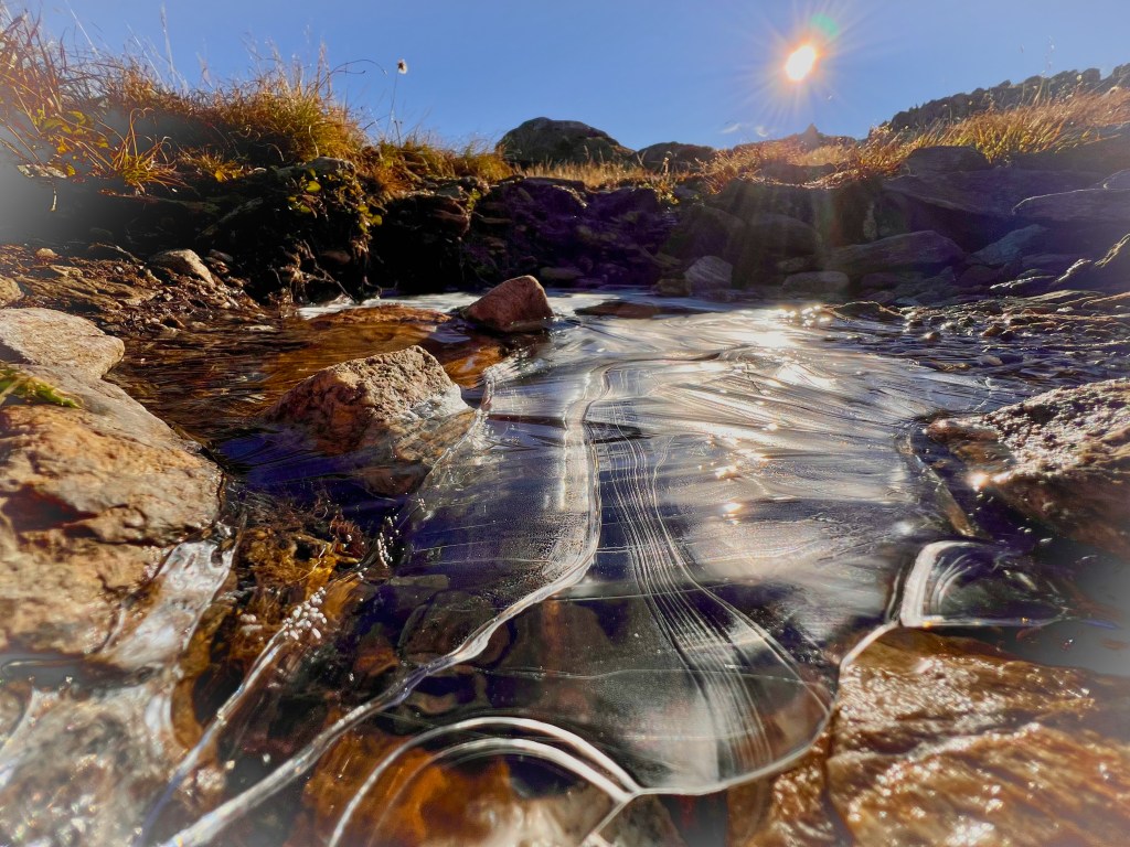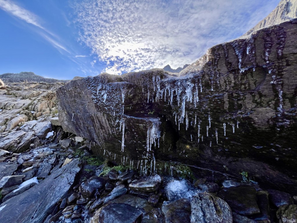 Zwischenzeitlich ziehen wir uns für einige Momente ins Zelt mit den wärmenden Schlafsäcken zurück. Diesmal aber präsentiert sich der Nachthimmel in seinem glänzendsten Kleid und lockt uns mit seinen Reizen zurück ins Freie. Der langersehnte Blick in die Weiten des Universums entschädigt uns für fast alles – auch für die klirrende Kälte, welche in der Nacht dafür sorgt, dass sich nicht nur Raureif auf unser Zelt legt, sondern sogar der Wasserfall festgefriert, von dem wir am frühen Abend eben noch Wasser abgeschöpft haben…