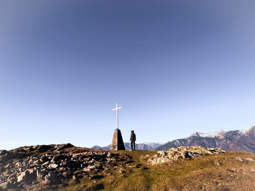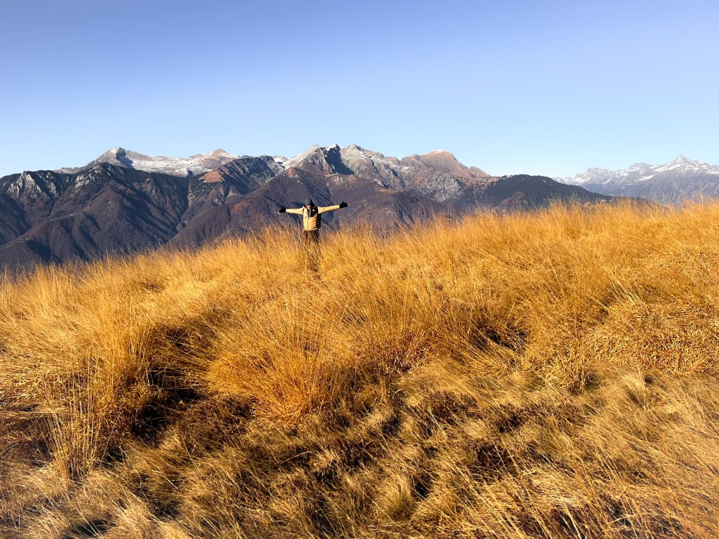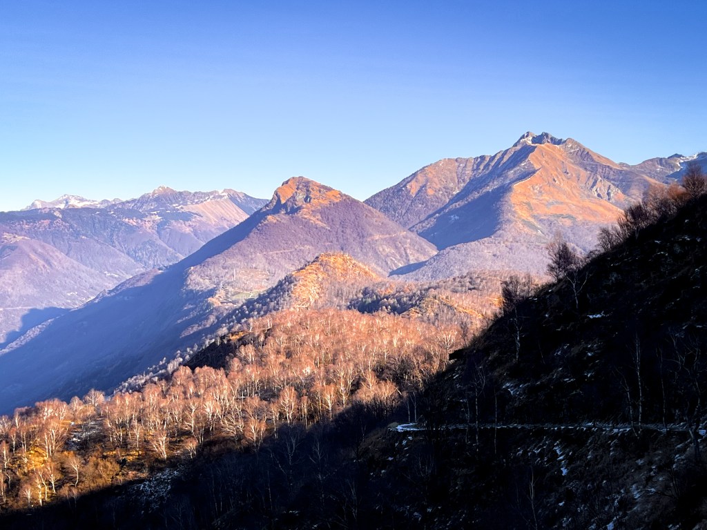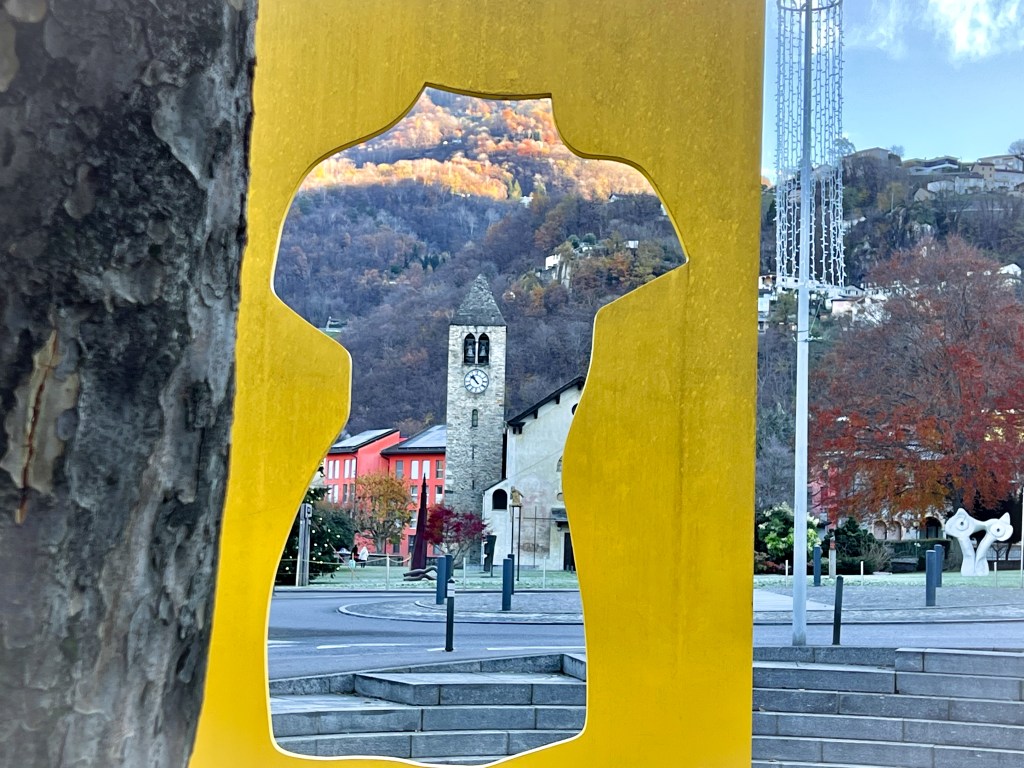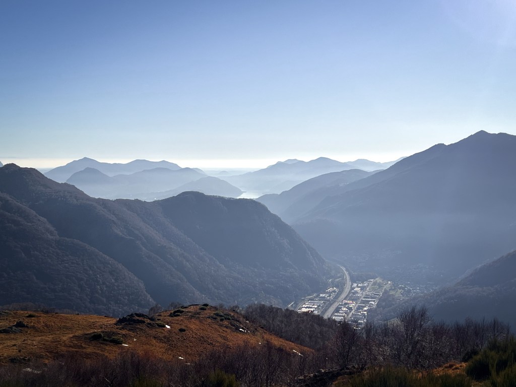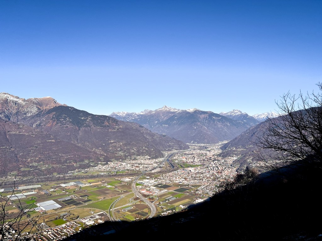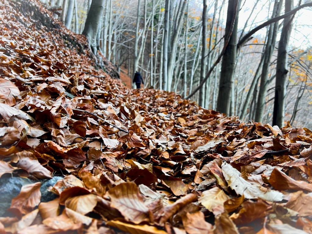 Dennoch wird uns ab Giubiasco Schritt für Schritt wärmer, als wir die steilen Kehren zum Cima di Dentro hochsteigen. Die etwas geisterhaft-verlassen wirkende Seilbahn lassen wir im wahrsten Sinne des Worte hängen. Stattdessen durchpflügen wir einen teilweise mehr als knöchelhohen Laubteppich, der im steilen Gefälle überraschend rutschig ist – und zwar so sehr, dass er beinahe der Gefahrenstufe des Aussichtsturms auf dem Wiseberg entspricht….