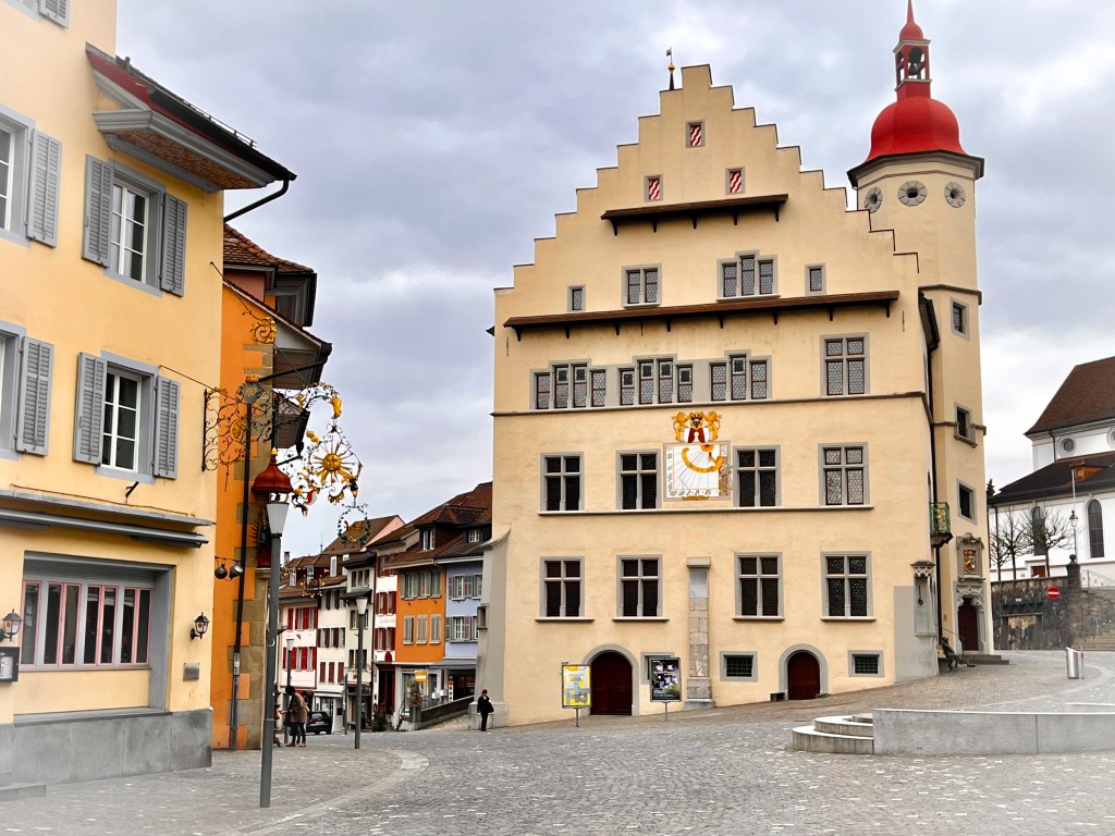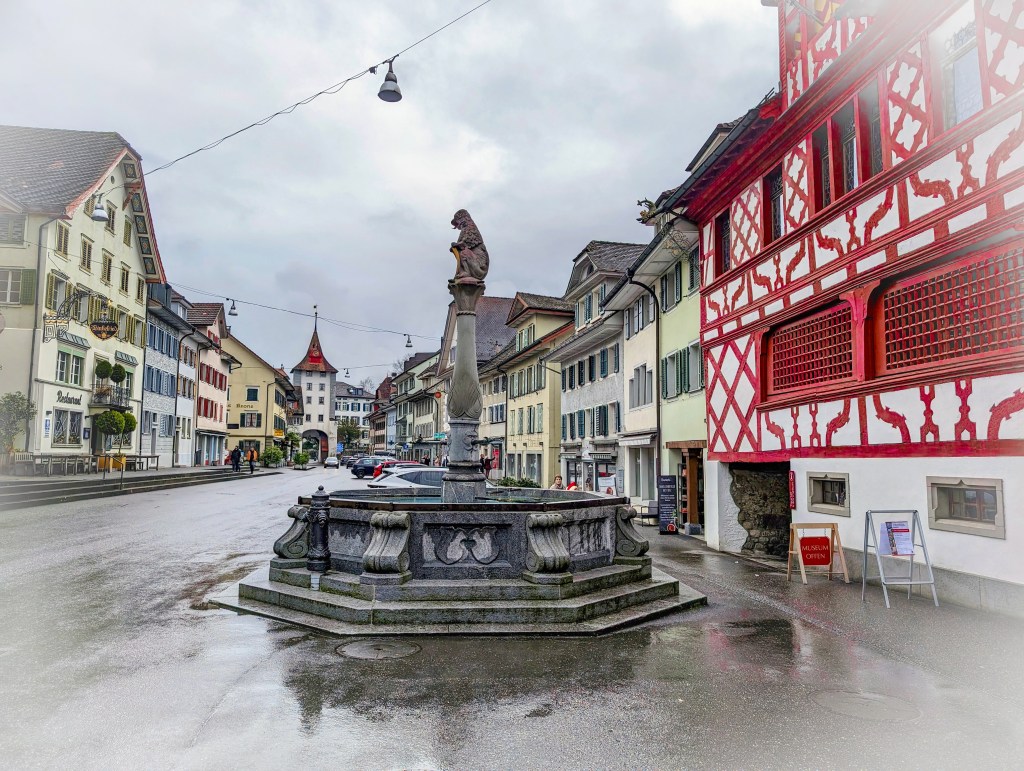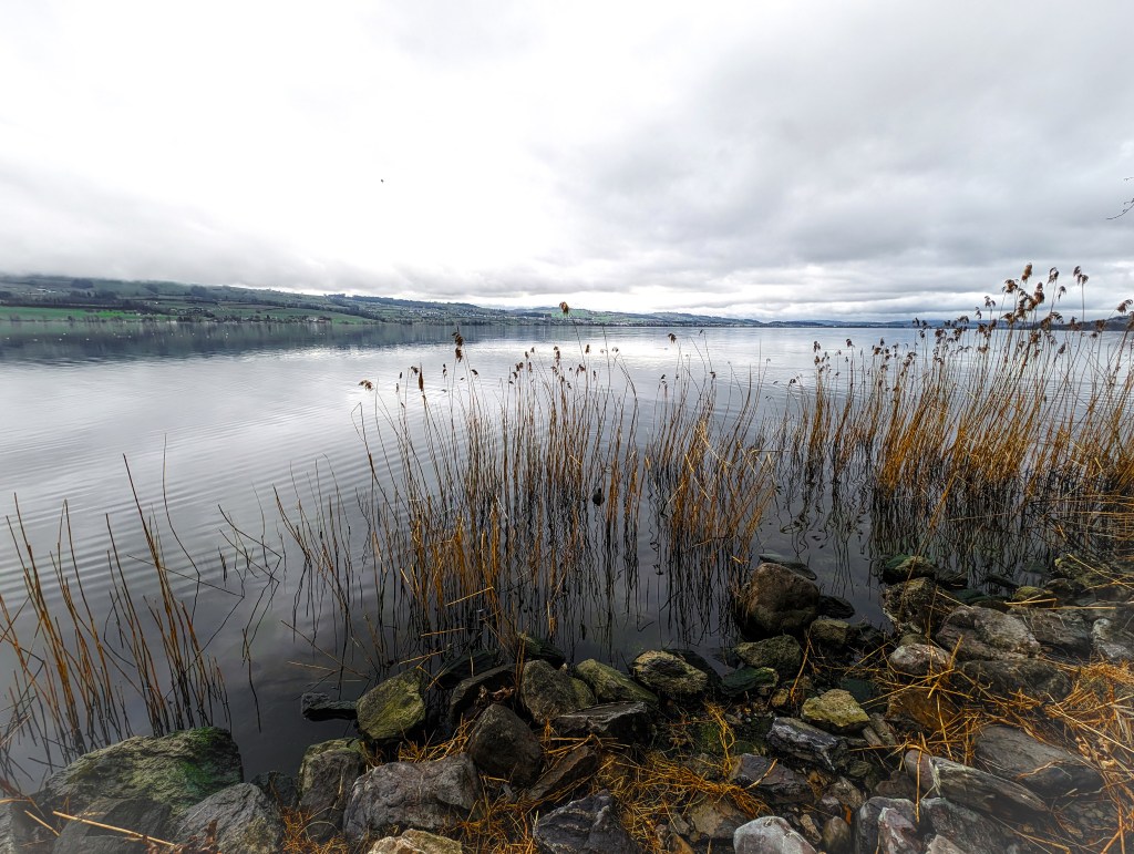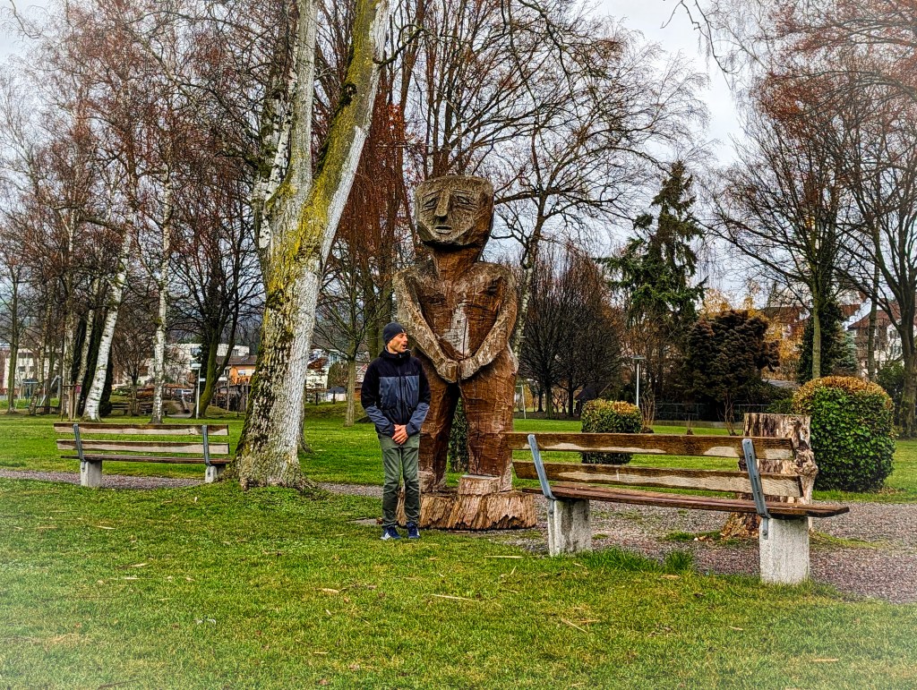 …Wir schlendern entlang des Ufers unter den wachsamen Augen des hölzernen Wächters von Sempach, der für uns allerdings eher so aussieht, als hätte auch er ein wenig Probleme mit dem Wasser – und zwar vor allem mit jenem in seinem Inneren (wenn er denn ein Innenleben hat). Die Stellung, in welcher er unbeweglich im kleinen Park verharrt, erinnerte uns auf jeden Fall stark an eine leichte Inkontinenz…